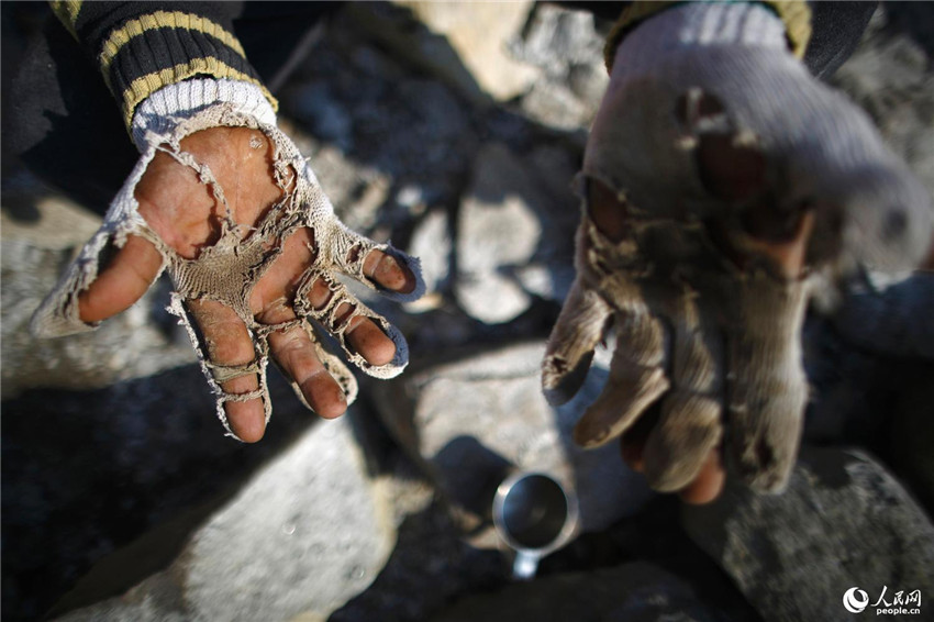 | Nur noch einige Stofffetzen: ein Arbeiter, der am Bau eines Hotels im nepalesischen Solukhumbu beteiligt ist, pr?sentiert am 27. April 2014 die Reste seiner Handschuhe. |