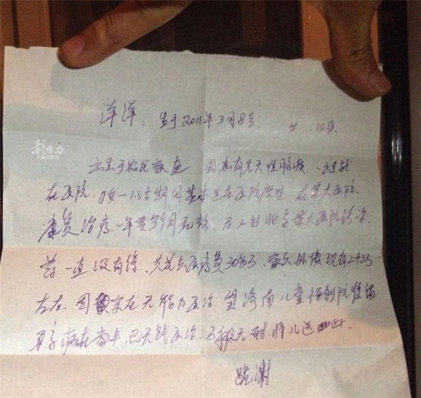 | In einem Brief erkl?rt der Vater seinen Beweggrund: Yangyang wurde am 8. M?rz 2011 geboren und litt seither an infantiler Zerebralparese. Die Familie hat für ihre Behandlung bereits über 300.000 Yuan RMB (34.620 Euro) ausgegeben - 230.000 Yuan RMB davon waren nur geliehen. |