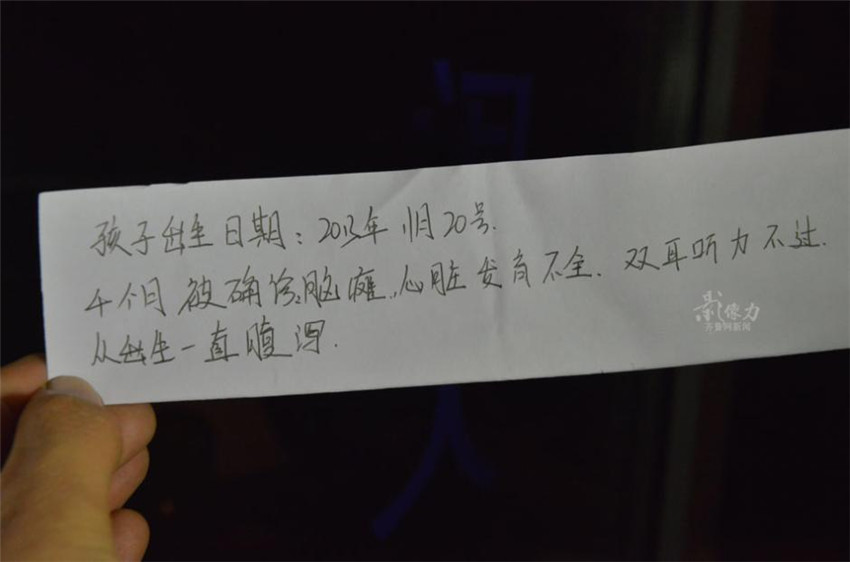 | Auf einem Zettel, der beim Kind gefunden wird, steht: ?Das Kind wurde am 20. November 2013 geboren. Es leidet an infantiler Zerebralparese, einem angeborenen Herzfehler, einer H?rbehinderung und hat seit der Geburt Durchfall. |
