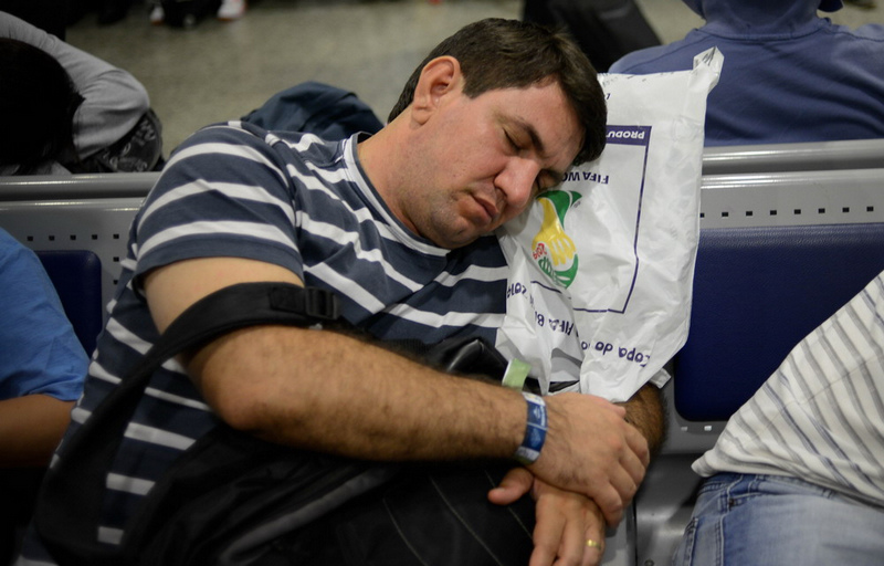| Auf dem Flughafen in Fortaleza schlafen die Fu?ballfans direkt auf den Sitzen oder sogar auf dem Boden. |