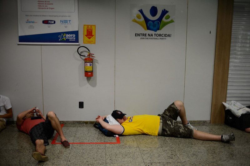 | Auf dem Flughafen in Fortaleza schlafen die Fu?ballfans direkt auf den Sitzen oder sogar auf dem Boden. |