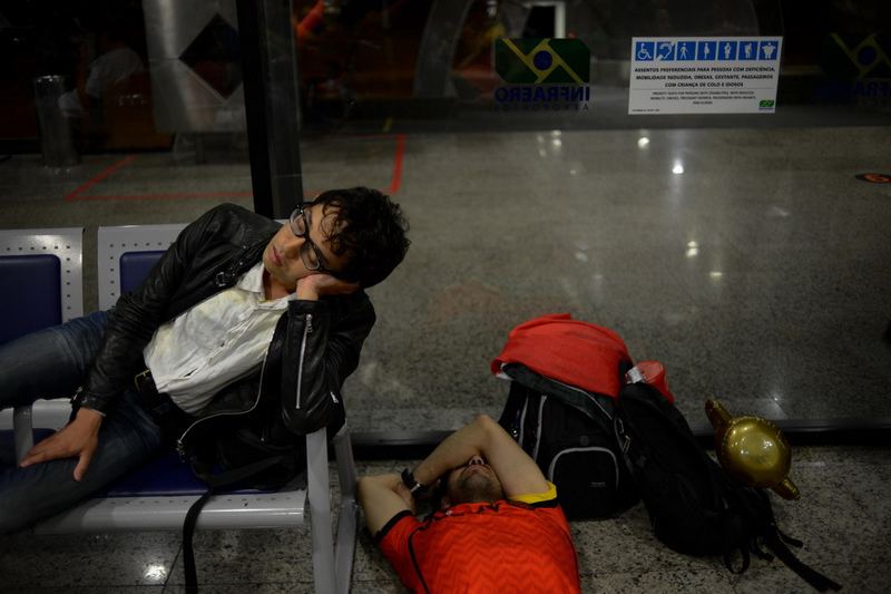 | Auf dem Flughafen in Fortaleza schlafen die Fu?ballfans direkt auf den Sitzen oder sogar auf dem Boden. |