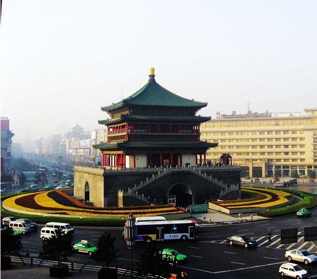 Der Glockenturm befindet sich mitten im Stadtzentrum. Er ist das Symbol von Xi’ans Altstadt. Der Turm wurde im Jahr 1384 w?hrend der Ming-Dynastie gebaut. Er geh?rt zu den Baudenkm?lern aus der Ming-Dynastie, die noch immer gut erhalten sind. Der Glockenturm ist eine Holzstruktur. Er ist bunt bemalt und in seinem Inneren teilweise noch mit Gold überzogen.