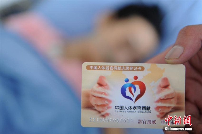 | Zhou ist bereit, ihre Organe nach dem Tod zu spenden. Ihr Mann zeigt den Organspende-Pass. |