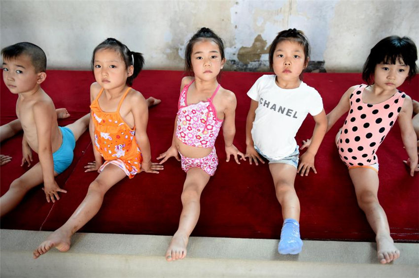 | In einem Trainingszentrum für Kunstturner in der Stadt Haozhou (Provinz Anhui) feilen die Nachwuchstalente unter der Leitung eines erfahrenen Trainers an ihrer Technik. |