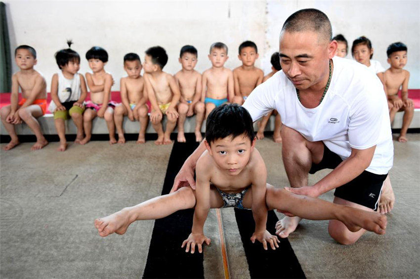 | In einem Trainingszentrum für Kunstturner in der Stadt Haozhou (Provinz Anhui) feilen die Nachwuchstalente unter der Leitung eines erfahrenen Trainers an ihrer Technik. |