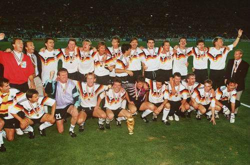 | Sommer 1990, Italien. Im Finale von Rom besiegt die deutsche Mannschaft Argentinien mit Kapit?n Diego Armando Maradona mit 1:0. Beckenbauer war damit der erste Deutsche, der den WM-Pokal als Spieler und als Trainer gewinnen konnte. |