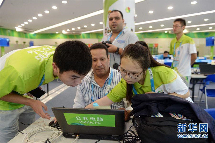 | Freiwillige helfen einem ?gyptischen Journalisten bei der Spracheneinstellung auf einem Computer im Medienzentrum. (Chen Yehua) |