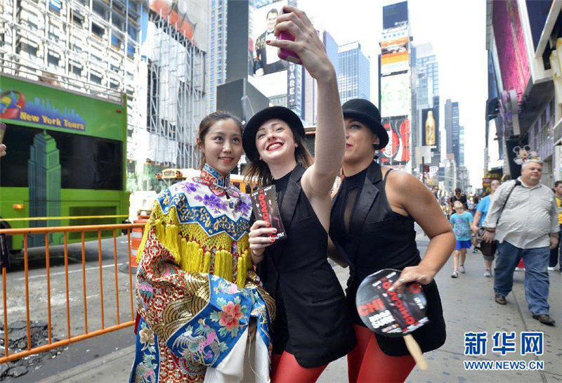 | Darsteller der Mei Lanfang-Operntruppe auf dem Times Square in New York |