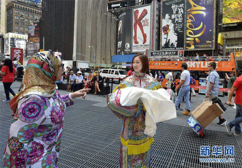| Darsteller der Mei Lanfang-Operntruppe auf dem Times Square in New York |