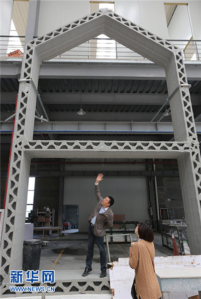 | Ma Yihe (links), der die Drucktechnik der H?user entwickelt hat, erkl?rt den Rohbau aus dem 3D-Drucker. (Foto vom 12. April) |