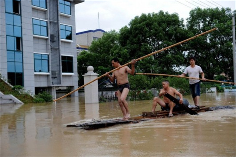 | Bewohner aus dem Dorf Wu bringen sich mit selbstgebauten Flo?en in Sicherheit. |