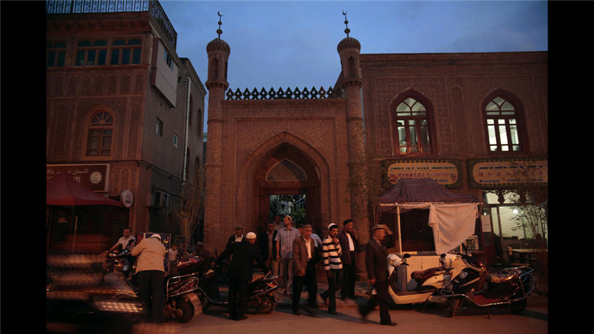 | M?nner beim Verlassen der Moschee nach dem Abendgebet. |