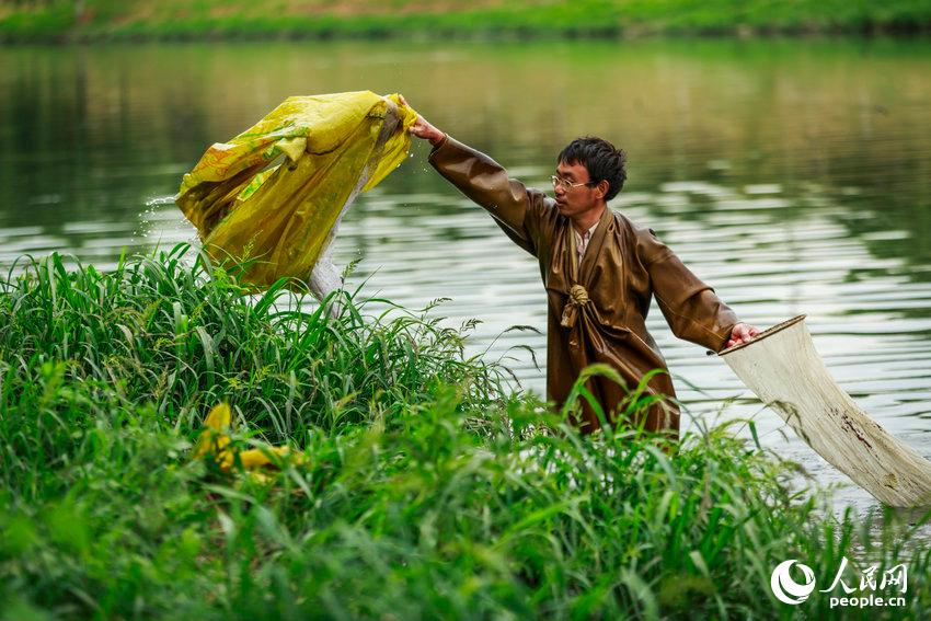| Nach einer ersten Fangrunde klettert Dong ans Ufer. |