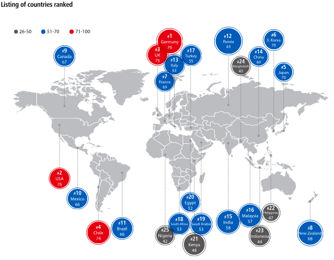 Huawei nahm in seine GCI-Rangliste 25 L?nder auf, die zu 68 Prozent des globalen BIP beigetragen haben. Der Index besteht aus 16 Indikatoren und zwei Variablen. Unter den 25 L?ndern steht Deutschland dank seines vollkommenen Vernetzungsgrads (dritter Platz unter allen L?ndern) und seiner relativ hohen Wachstumsdynamik (zweiter Platz unter den entwicklten L?ndern) auf dem ersten Platz. Die Entwicklungsl?nder Chile und Kenia k?nnen im Bereich der IKT-Entwicklung einer positiven Zukunft entgegensehen. Die asiatischen L?nder Südkorea und Japan mit ihren führenden IKT-Technologien stehen auf dem fünften und sechsten Platz.