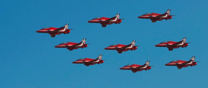 | Die ?Red Arrows“ der britischen Royal Air Force gibt eine Kostprobe ihres K?nnens. |