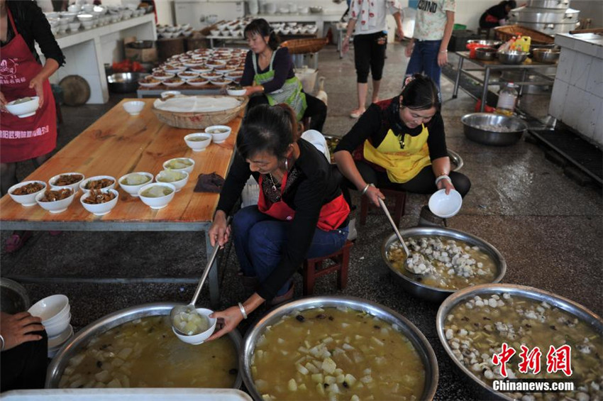 | Die Familie des Hochzeitspaars bereitet zusammen mit Aushilfen vom Dorf die Gerichte vor. |