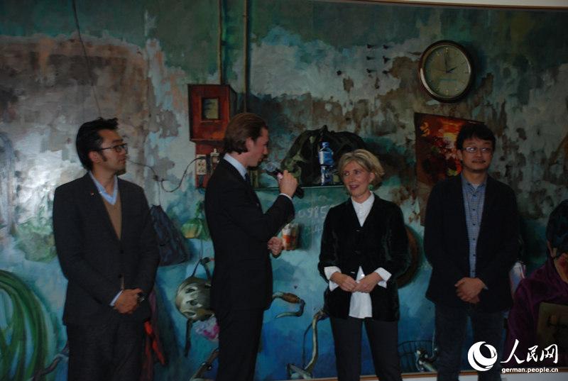 | Bei der Er?ffnungsfeier: (von links) der Direktor des Today Art Museums, Alex Gao, der ?sterreichische Bundesminister für Europa, Integration und ?u?eres, Sebastian Kurz, die Malerin Xenia Hausner, und der Kurator dieser Ausstellung, Liang Kegang (Foto: He Xin, Beijing) |