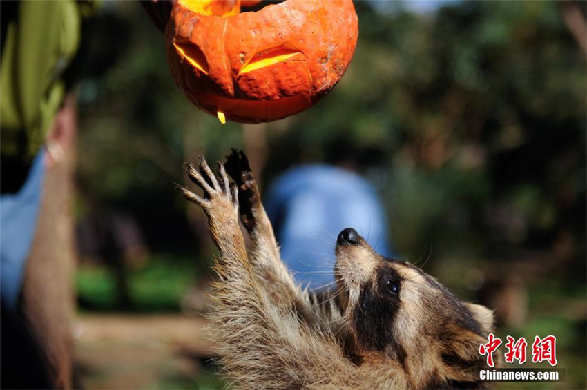 | In einem Wildpark in Yunnan starren die Waschb?ren neugierig eine Kürbislaterne an. (Foto: Liu Ranyang) |