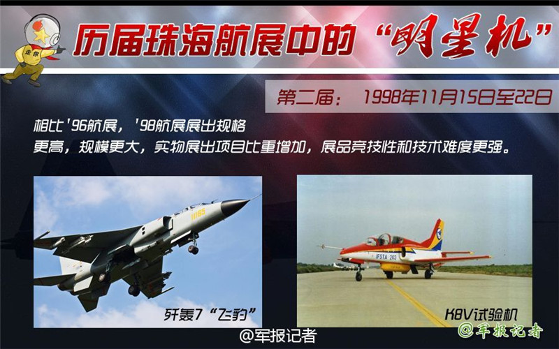 | Eine JH-7 (links) und ein K8V-Testflugzeug (rechts) an der zweiten Ausstellung in Zhuhai vom 15. bis zum 22. November 1998. |