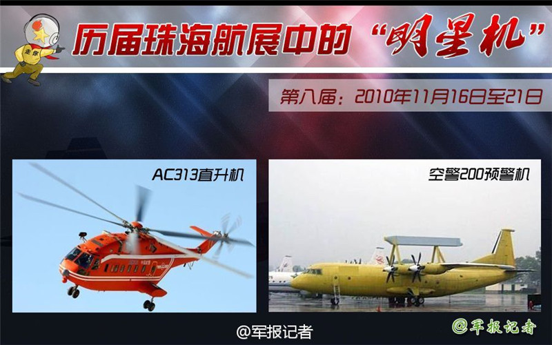 | Ein AC313-Hubschrauber (links) und ein F200-Frühwarnflugzeug (rechts) an der achten Ausstellung in Zhuhai vom 16. bis zum 21. November 2010. |