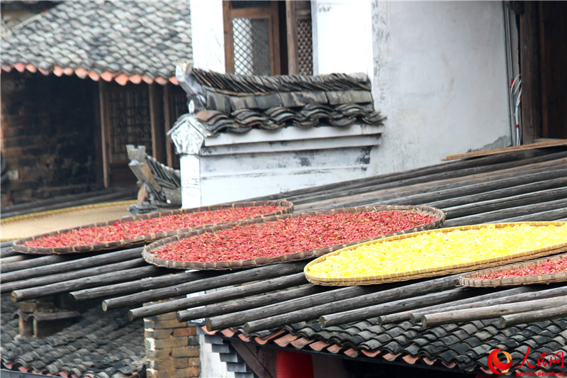 | Im Herbst werden rote Chilischoten, orange Kürbisschnitze und gelbe Chrysanthemenblüten zum Trocknen auf die D?cher gelegt. Zusammen ergeben sie eine wunderbare Farbenpracht. |
