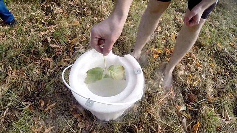 | Konowalow erkl?rt die Wirkung von Flüssigstickstoff mit einem Blatt. |