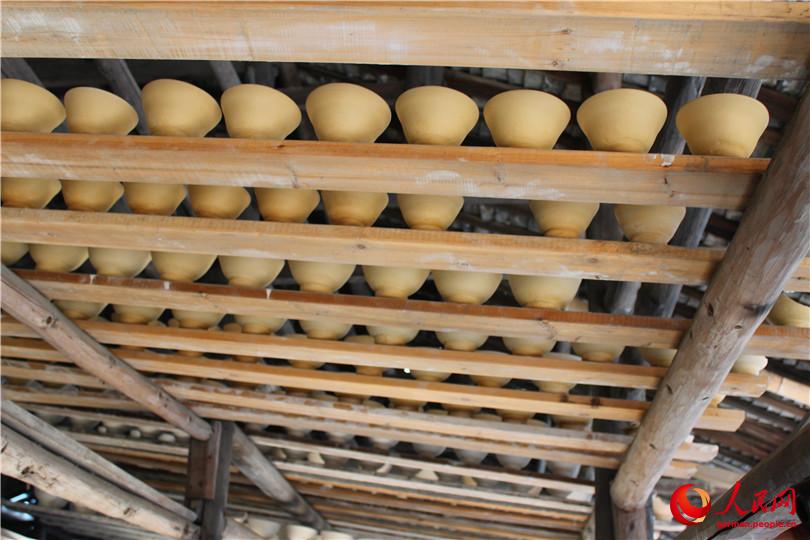 | Halbfertigte Porzellanschalen stehen ordentlich auf den Holzbrettern und werden an der Sonne getrocknet. |
