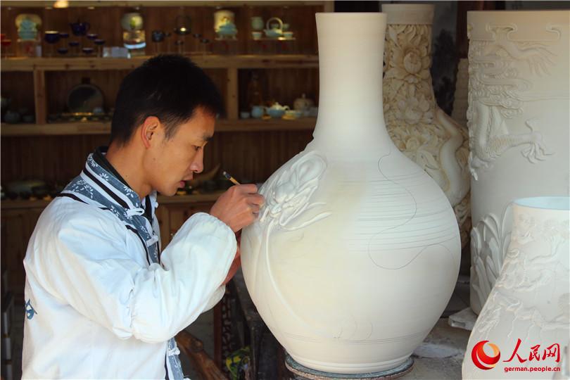 | Modellier-Meister Xia Bo arbeitet an einer Porzellanvase. Normalerweise ben?tigt Xia einen Monat für ein komplexes Werk dieser Gr??e. Xia lernte das Modellieren, das mit einer Schnitztechnik verglichen werden kann, als Jugendlicher. Nach etwa vier Jahren war er f?hig, einfache Motive zu gestalten. Für schwierigere Motive wie dasjenige, das er vor Kurzem begonnen hat, braucht es l?ngere Erfahrung. Für seine Arbeit benutzt Xia keine Schablone oder Vorlage – er l?sst seiner Inspiration freien Lauf. |