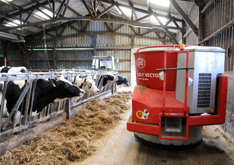 | In Frankreich füttert ein Roboter das Milchvieh mit Gras. Der Roboter kostet 140.000 Euro. Der hohe Preis lohnt sich aber alleweil. Denn der Roboter erh?ht die t?gliche Milchleistung pro Kuh um 35 Liter. |