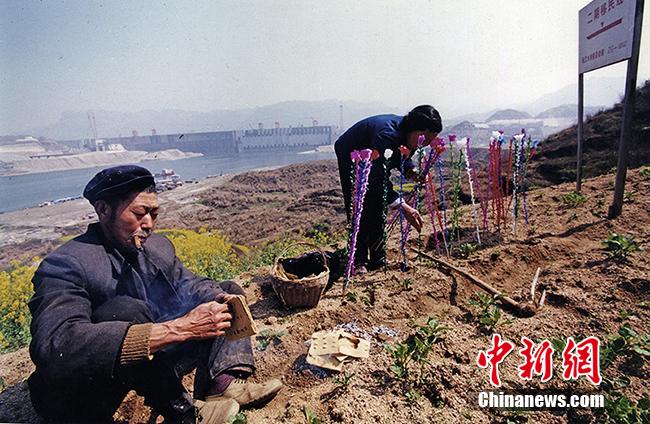 20. M?rz 2001 – Kurz vor dem Totengedenkfest Qingming opfern Zhang Jianguo und seine Frau vor dem Damm ihren Vorfahren. Der Ahnenfriedhof existiert nicht mehr. Die Zhangs geh?ren zu den ersten Bewohnern der neuen Stadt Zigui.