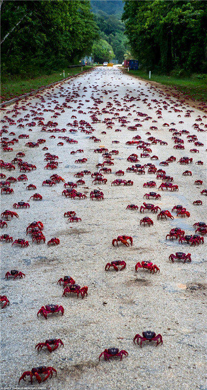 Auf der Weihnachtsinsel in Australien ist jetzt die Jahreszeit für die Wanderung der roten Krabben. Sie verlassen ihre Nester in den W?ldern und ziehen ans Meer, um sich zu paaren und Nachkommen zu produzieren. Etwa 12 Millionen rote Krebse leben auf der Insel. Jedes Jahr beim Umzug bieten sie ein fantastisches Naturschauspiel. Ganze Stra?en verwandeln sich in einen lebendigen, roten Teppich.