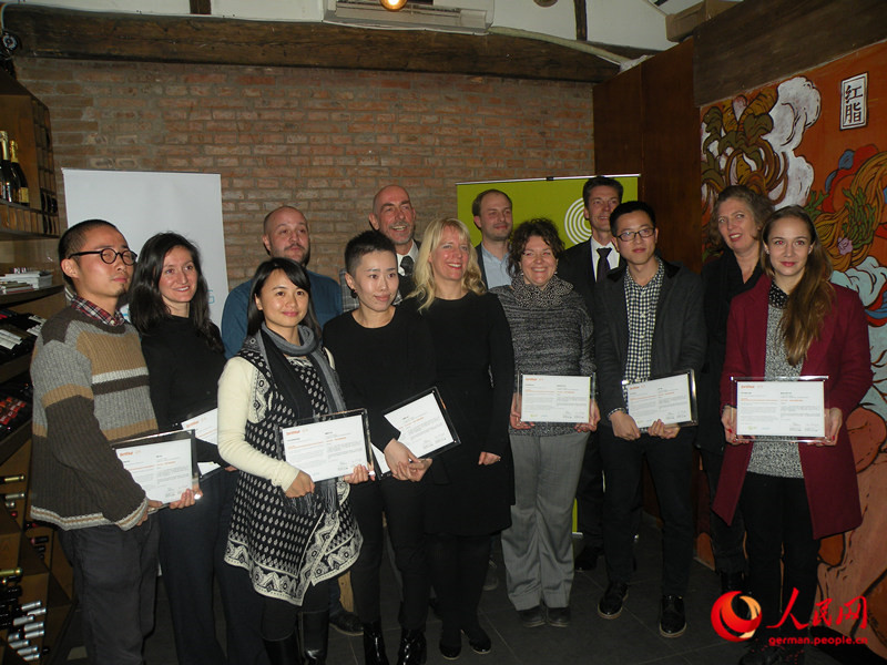 Gruppenfoto der Teilnehmer 2014 mit dem Leiter des Kulturreferats der deutschen Botschaft Peking Enrico Brandt, dem Leiter des Goethe-Instituts Peter Anders, Herrn Caspar Welbergen von der Stiftung Mercator, der Seminarleiterin in Hamburg Dr. Gesa Birnkraut von dem Institut für Kulturkonzepte Hamburg e.V. (Mitte) sowie der Seminarleiterin in Shanghai Katja Hellkoetter von CONSTELLATIONS International (Zweite rechts).