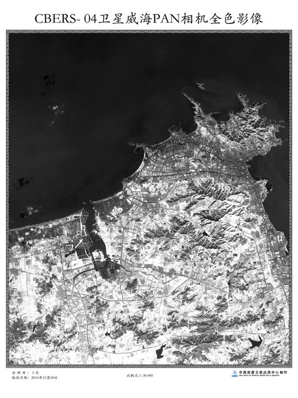 | Eine panchromatische Aufnahme von Weihai, aufgenommen mit der PAN-Kamera. |