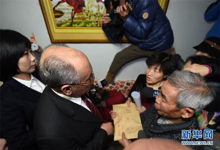 | Der Vizepr?sident des H?heren Volksgericht Zhao Jianping (zweiter von links) gibt das ?Schmerzensgeld“ an Hugjiltus Eltern weiter. |