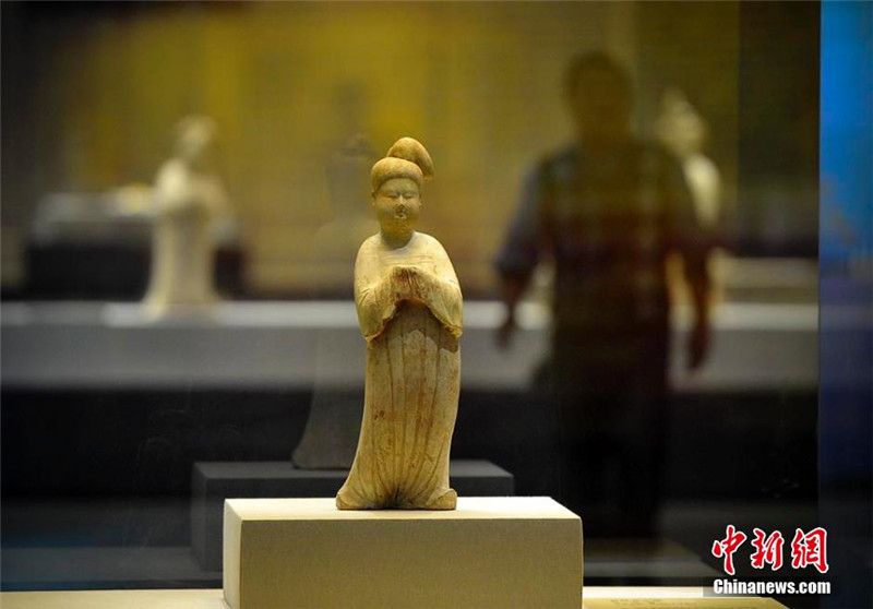 Die Besucher bestaunen die bunten Tonfiguren der Palastdamen in der Tang-Dynastie.