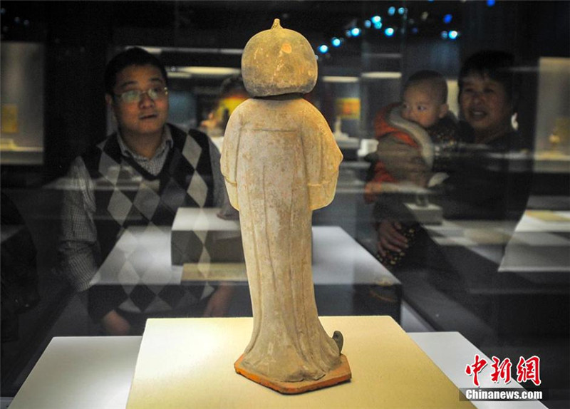 | Die Besucher bestaunen die bunten Tonfiguren der Palastdamen in der Tang-Dynastie. |
