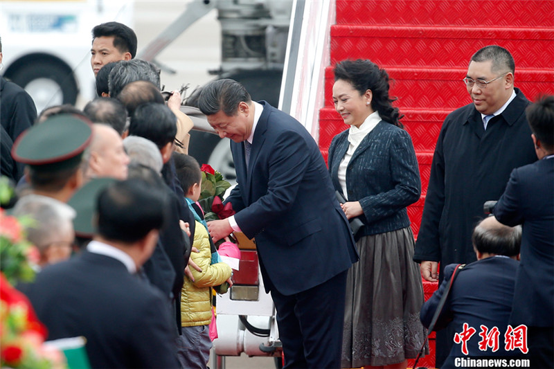 | Staatspr?sident Xi und seine Ehefrau Peng werden beim Flughafen von dem Chefadministrator der chinesischen Sonderverwaltungszone Macao, Fernando Chui Sai On, begrü?t. |