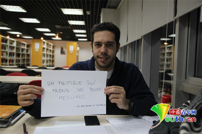 | Der 27-j?hrige Spanier José kam vor drei Monaten nach China, um an der Beijing Normal University Chinesisch zu lernen. Er hofft, in Zukunft den Wirtschaftsaustausch zwischen China und Spanien f?rdern zu k?nnen. In seinen Augen ist ?Uncle Xi“ ein gro?artiger Reformer, der für Chinas Entwicklung die richtigen Richtlinien und politischen Ma?nahmen festgelegt hat. |