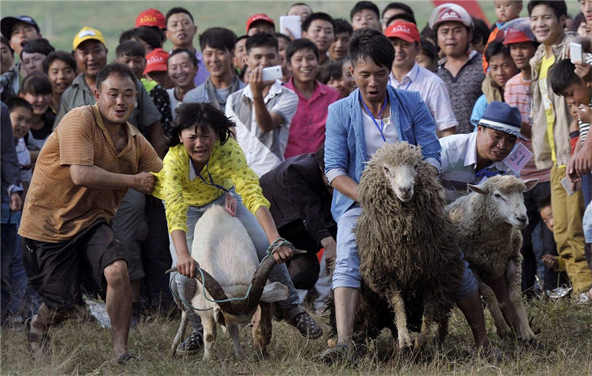 An einem Fest in Fengshan reiten die Bewohner auf Schafen und Ziegen.