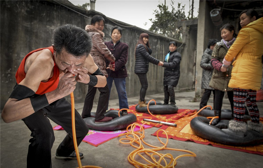 | Mit seiner Nase bl?st Nie Yongbing in 21 Minuten vier Reifen auf, w?hrend acht Menschen darauf stehen. Sein Arzt hat ihm diese Methode zur Verbesserung seiner Gesundheit vorgeschlagen. |