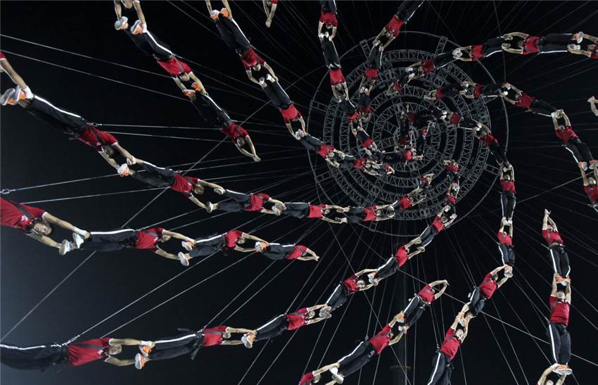 | Die Schüler einer Shaolin-Kungfu-Kunstschule schweben w?hrend ihrer Aufführung an der Er?ffnungsfeier der Olympischen Jugendsommerspiele in Nanjing in der Luft. |