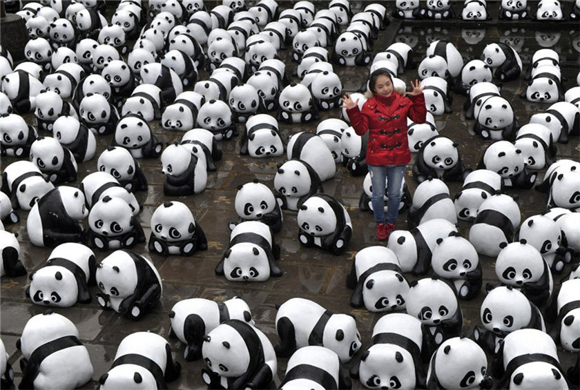 | Eine junge Frau posiert w?hrend einer Ausstellung in Hefei in der Provinz Anhui mit "Pandas". |