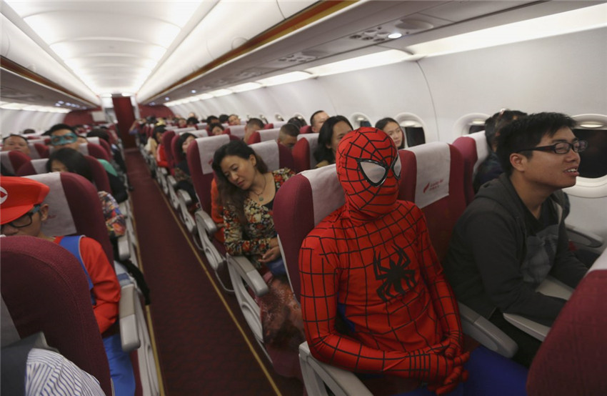 Ein Besatzungsmitglied der Lucky Air verkleidet sich an Halloween w?hrend dem Flug von Kunming nach Shenzhen als Spiderman.