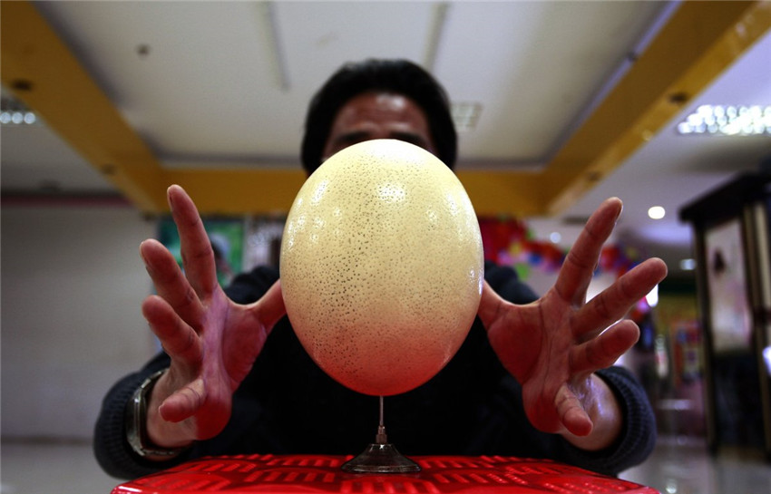 | Der 50-j?hrige Cui Juguo aus der Provinz Hunan balanciert ein Strau?enei auf einer Nadel. Er hat dafür sechs Jahre geübt. |