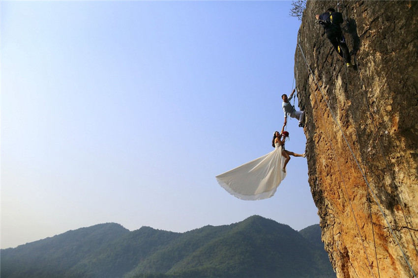 | Zheng Feng, ein leidenschaftlicher Kletterer, macht mit seiner Braut Hochzeitsfotos an einer Felswand in Jinhua in der Provinz Zhejiang. |