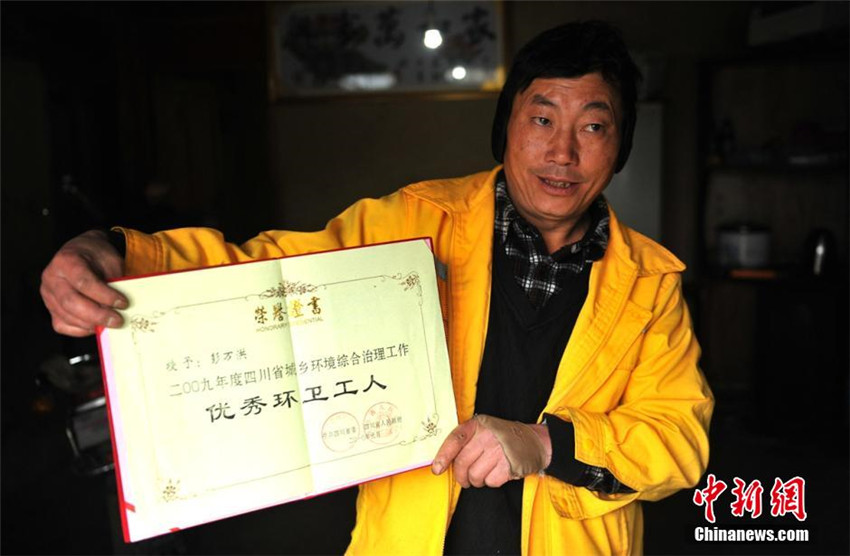 Peng zeigt mit Stolz seine Auszeichnung für die harte Arbeit.