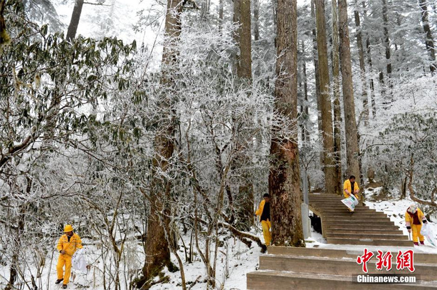 | Die Müllm?nner sammeln den Abfall auf einer Treppe auf. |