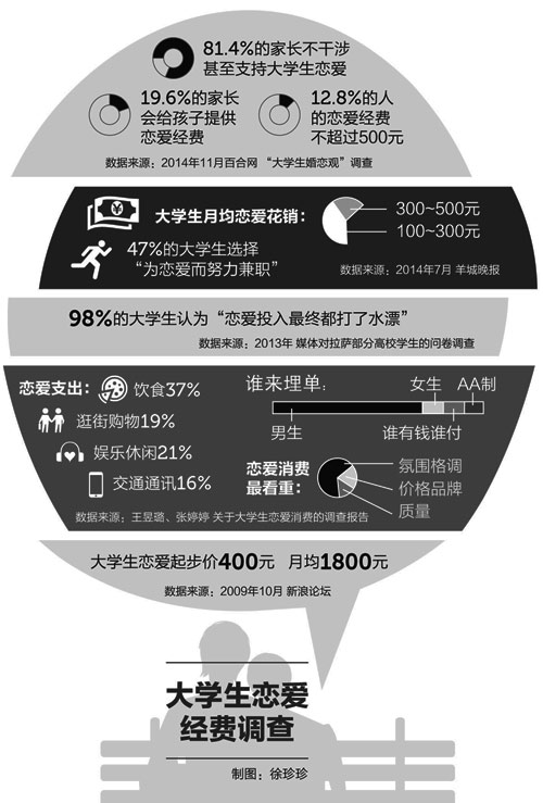 12,8 Prozent der chinesischen Studenten geben monatlich weniger als 500 Yuan (knapp 76 Euro) für ihre Liebesbeziehung aus. Dies geht aus einer Untersuchung hervor, die das Partnervermittlungsportal Baihe im November 2014 durchgeführt hat. Gem?? einer Umfrage der Yangcheng Evening News vom Juli 2014 sind 47 Prozent der befragten Studenten bereit, eine Teilzeitarbeit anzunehmen, um ihre Beziehung finanzieren zu k?nnen.