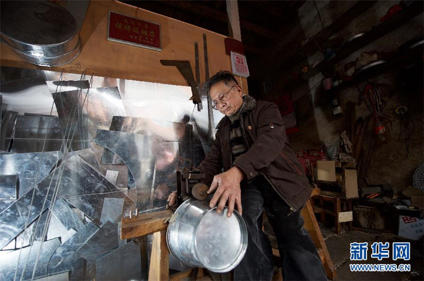 | Li Weimao stellt in seinem kleinen Gesch?ft aus Eisen Trommeln her. Der 70-J?hrige hat die dazu notwendige Technik von seinem Vater gelernt. |